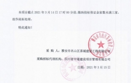本項(xiàng)目截止2021年2月18日17時(shí)00分前,繳納投標(biāo)保證金家數(shù)未滿(mǎn)三家,故作流標(biāo)處理。特此通知!采購(gòu)人:雅安市名山區(qū)茶城建設(shè)工程有限公司采購(gòu)招標(biāo)代理機(jī)構(gòu):四川省中遂建設(shè)項(xiàng)目管理有限公司日期:2021年2月20日...